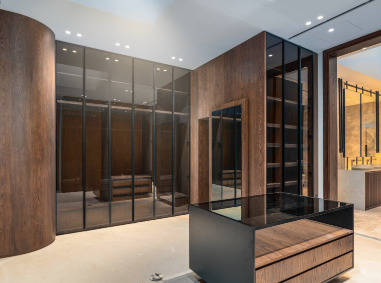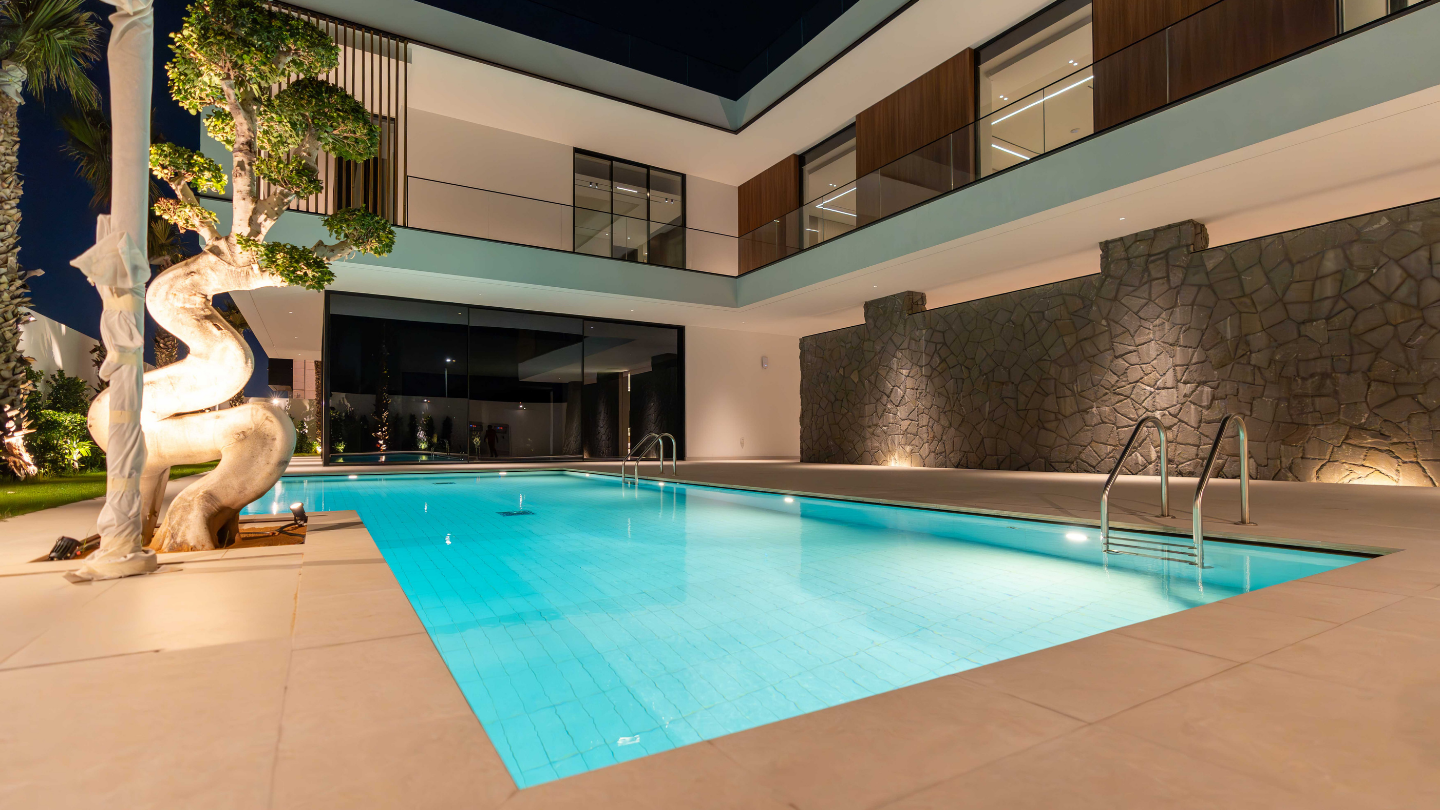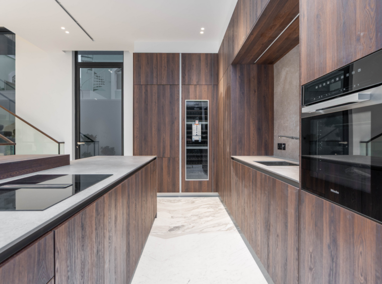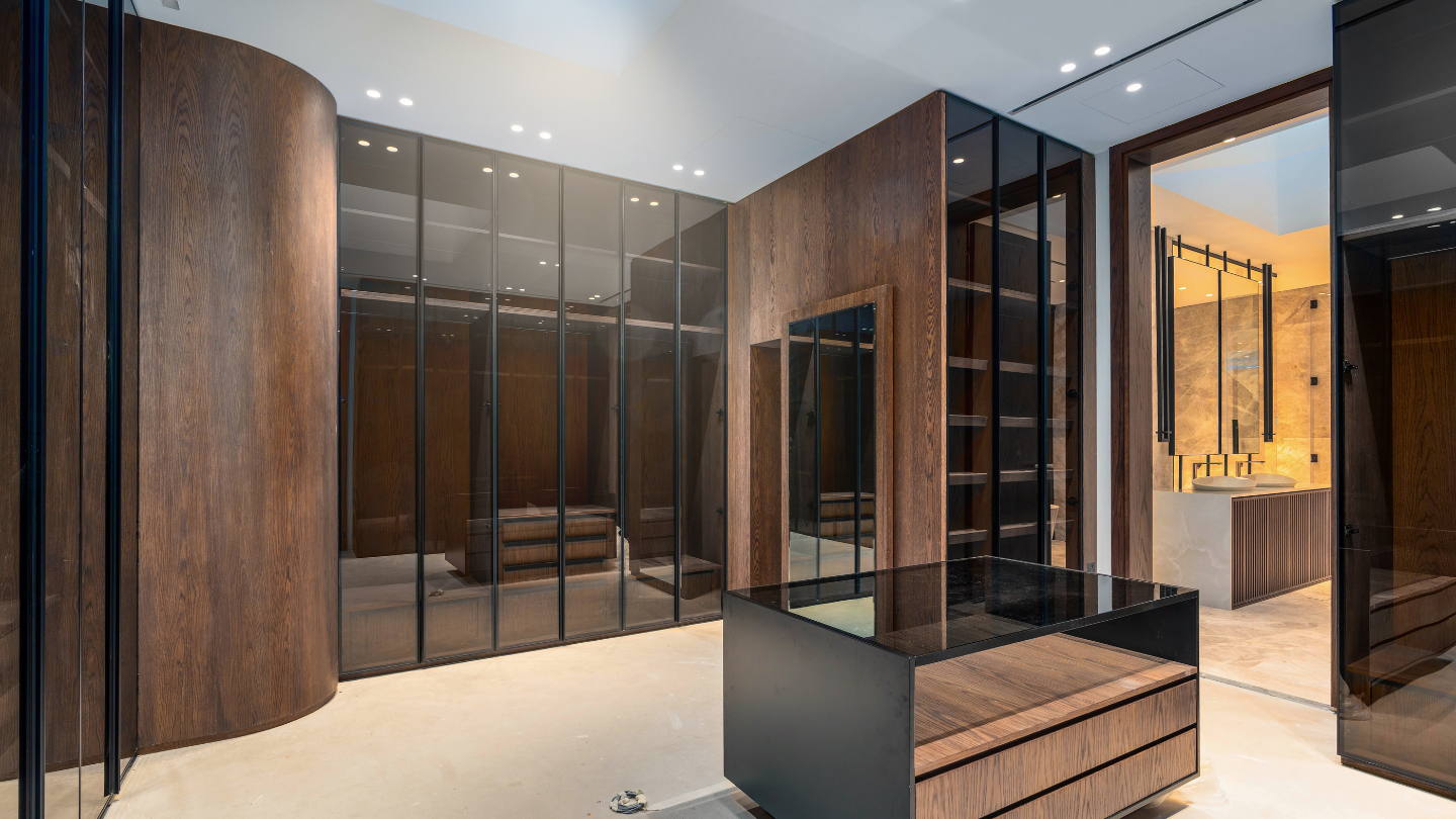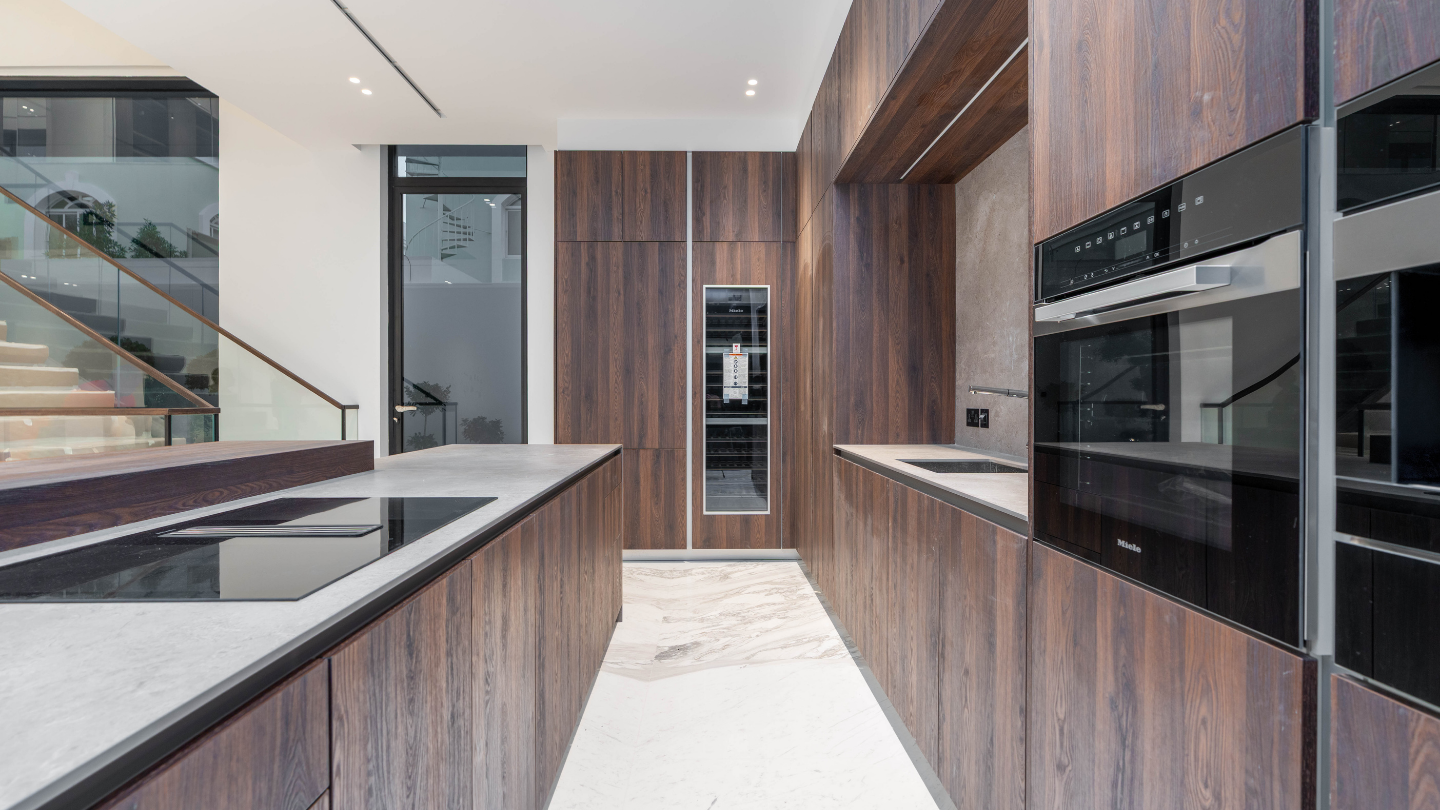 The villa boasts a show kitchen and a dirty kitchen by Poggenpohl, a custom safe in the master bedroom closet, and a 4-floor lift.